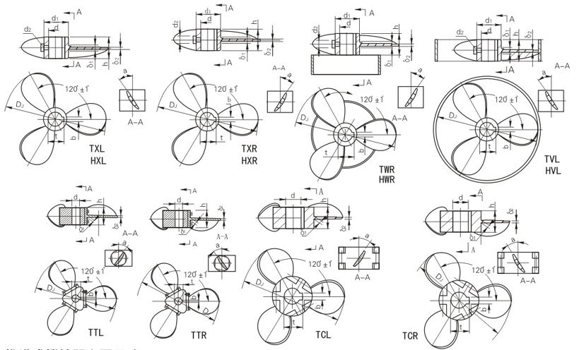 三葉左旋推進(jìn)式-TXL、三葉右旋推進(jìn)式-TXR、三葉左旋穩(wěn)定環(huán)推進(jìn)式-TWL、三葉右旋穩(wěn)定環(huán)推進(jìn)式-TWR、三葉左旋導(dǎo)流筒推進(jìn)式-TVL、三葉右旋導(dǎo)流筒推進(jìn)式-TVR、三葉焊接左旋推進(jìn)式-HXL、三葉焊接右旋推進(jìn)式-HXR、三葉焊接左旋穩(wěn)定環(huán)推進(jìn)式-HWL、三葉焊接右旋穩(wěn)定環(huán)推進(jìn)式-HWR、三葉焊接左旋導(dǎo)流筒推進(jìn)式-HVL、三葉焊接右旋導(dǎo)流筒推進(jìn)式-HVR、三葉可調(diào)左推進(jìn)式-TTL、三葉可調(diào)右旋推進(jìn)式-TTR、三葉可拆左旋推進(jìn)式-TCL、三葉可拆右旋推進(jìn)式-TCR